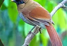 棕噪鹛中型鸟类,体长25~28厘米。上体赭褐色,头顶具黑色羽缘,尾上覆羽灰白色,尾羽棕栗色,外侧尾羽具宽阔的白色端斑。额、眼先、眼周、耳羽上部、脸前部和颏黑色,眼周裸皮蓝色,极为醒目。喉和上胸与背同色,…全部>>