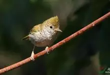 白腹凤鹛是绿鹃科、绿凤鹛属的小型鸟类,体长10-12厘米。上体从头到尾黄绿色,有短的羽冠,头顶微具黑色羽轴纹;眼先、眼周,耳羽和下体灰白色,尾下覆羽黄色。虹膜褐色或红褐色,上嘴浅褐色或肉褐色,…全部>>