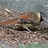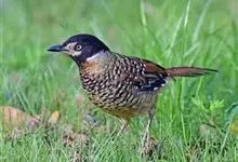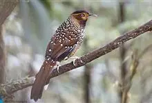 眼纹噪鹛为画眉科噪鹛属的鸟类。中型鸟类,体长30-34厘米。头、颈黑色,脸、眉纹和颏茶黄色,上体棕褐色满杂以白色、黑色和皮黄色斑点,飞羽具白色端斑,尾具白色端斑和黑色亚端斑。喉黑色,胸棕黄色具黑色横斑。…全部>>