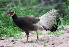 黑长尾雉大型鸡类,体长53~88厘米。雄较雌大。雄鸟通体紫蓝色,脸鲜红色,翅上有一条显著的白色翅斑,尾甚长,黑色,具显著的白色横斑,脚绿褐色。雌鸟通体橄榄褐色,脸红色,背和翅满布棕褐色斑纹和灰白色羽…全部>>