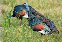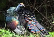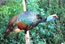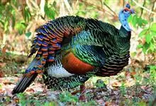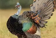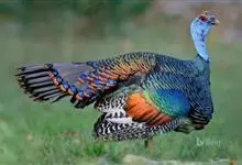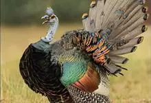 眼斑吐绶鸡:是火鸡科的两种鸟类之一。体型比普通火鸡略小些,体长1米左右,体重2.4-5.4千克,雄性比雌性略大,长得很特别,蓝色的秃脑袋上冒出几个橙黄色的疙瘩。但是它羽色艳丽,身体呈铜色及绿色。…全部>>