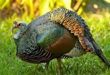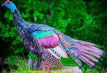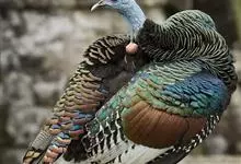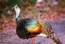 眼斑吐绶鸡:是火鸡科的两种鸟类之一。体型比普通火鸡略小些,体长1米左右,体重2.4-5.4千克,雄性比雌性略大,长得很特别,蓝色的秃脑袋上冒出几个橙黄色的疙瘩。但是它羽色艳丽,身体呈铜色及绿色。…全部>>