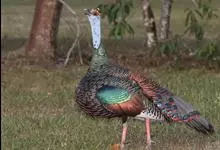 眼斑吐绶鸡:是火鸡科的两种鸟类之一。体型比普通火鸡略小些,体长1米左右,体重2.4-5.4千克,雄性比雌性略大,长得很特别,蓝色的秃脑袋上冒出几个橙黄色的疙瘩。但是它羽色艳丽,身体呈铜色及绿色。…全部>>
