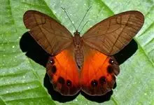 翅正面淡灰褐色,多褐色波纹状线,前后翅的外缘和亚缘线3条,中横线1条,前翅中室5条,从前室前缘到后翅cu2室有1列眼状纹,以两翅的m3室斑及cu1室斑为最显著,内半部橘红色,外半部黑色,…全部>>