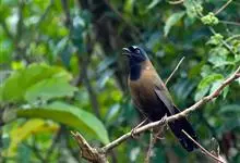 大噪鹛:中型鸟类,体长32-36厘米。额至头顶黑褐色,背栗褐色满杂以白色斑点,斑点前缘或四周还围有黑色。初级覆羽、大覆羽和初级飞羽具白色端斑。尾特长,均具黑色亚端斑和白色端斑。颏、喉棕褐色,…全部>>