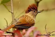 条纹噪鹛是画眉科、噪鹛属中型鸟类,体长28-32厘米。头具短的羽冠,上体栗褐色,飞羽外翻蓝灰色。下体棕栗色,腹以后转为褐白色。除飞羽和尾羽外,所有上、下体羽均具白色羽干纹。极为醒目。野外特征明显,…全部>>