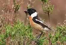 黑喉石鵖,雀形目鹟科石鵖属小型鸣禽,俗名谷尾鸟、黑喉石。其体色为黑褐色。雄鸟头部、背部、两翼及尾黑色,颈侧及翼上具白斑,胸部和腹侧红棕色,腰及尾下覆羽白色。雌鸟体色为褐色,上体具深色纵纹,胸部染棕色,…全部>>