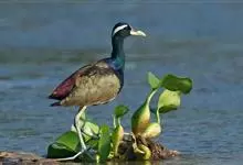 铜翅水雉雉鸻科铜翅水雉属的一种物种,是小型涉禽,体长28-31厘米。头颈、下体黑色,具金属色辉。从眼到颈有白色纵纹,背、内侧初级一飞羽橄榄铜绿色,尾下覆羽栗色。跗蹠的前后均有盾状鳞,趾、爪均甚长,…全部>>