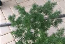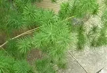 蓬莱松是天门冬科、天门冬属多年生丛生草本植物。宿存,圆柱形肉质根,纵截面为绿色和表面灰色。植株高可达3米。茎呈圆柱形或近四边形,底部木质化,具有灰色或灰褐色。幼嫩的茎在每个节上都被紫绿色鳞片包,…全部>>