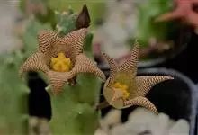 巨花犀角又称大豹皮花,是夹竹桃科犀角属的一种植物。茎粗,花大,边缘生长细毛。植株柱形多分枝呈丛生,柱形具4棱,棱缘具细小疣突。花大,五角星形黄色,并有横向棕褐色斑纹,似豹皮而得名。花期夏秋两季。…全部>>