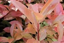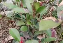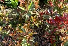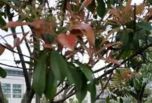 红叶石楠 是蔷薇科,石楠属杂交种,为常绿小乔木或灌木,乔木高可达5米、灌木高可达2米。叶片革质,长圆形至倒卵状、披针形,叶端渐尖,叶基楔形,叶缘有带腺的锯齿,花多而密,复伞房花序,花白色,梨果黄红色,…全部>>