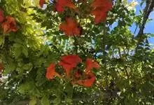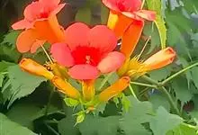 凌霄 Schum.),别名上树龙、五爪龙、九龙下海等,为紫葳科凌霄属的攀援藤本植物。其茎木质,以气生根攀附于它物之上。叶对生,为奇数羽状复叶;小叶卵形至卵状披针形,边缘有粗锯齿;顶生疏散的短圆锥花序,…全部>>