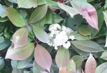 石楠 Kalkman),是蔷薇科石楠属的常绿乔木,高5~12米,株型紧凑,树冠圆球形。树枝为褐灰色;鳞片为褐色,没有毛;叶片革质,长椭圆至侧卵状椭圆形,有锯齿,新叶红色光亮。复伞房花序,白色小花,…全部>>