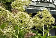 石楠 Kalkman),是蔷薇科石楠属的常绿乔木,高5~12米,株型紧凑,树冠圆球形。树枝为褐灰色;鳞片为褐色,没有毛;叶片革质,长椭圆至侧卵状椭圆形,有锯齿,新叶红色光亮。复伞房花序,白色小花,…全部>>
