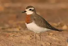 东方鸻:属小型涉禽。体重80-95克,体长220-255毫米。在夏季,前额、眉纹和头的两侧白色,头顶、背褐色或沙褐色。颏、喉白色,前颈棕色,胸棕栗色,其下有一黑色胸带紧靠其后,其余下体白色。嘴细长,…全部>>