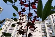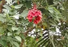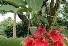 翅果刺桐 Merr.)是豆科,刺桐属乔木,高12-15米,具粗壮的刺。羽状复叶具3小叶,小叶膜质,卵状三角形,先端短渐尖,基部圆或宽楔形,两面无毛;总状花序长7-10厘米,有褐色绒毛;花红色,花萼钟状,…全部>>