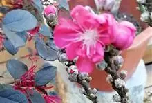 红叶碧桃是蔷薇科李属的一种落叶小乔木,是碧桃的一个变异品种。其小枝呈红褐色,单叶互生,叶片呈卵圆状披针型,在生长初期,叶子为鲜红色。花为重瓣状,呈桃红色。核果为球形,果皮周围有短的茸毛,并且内含蜜汁。…全部>>