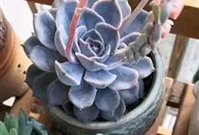 蓝石莲是景天科、拟石莲花属的多肉植物。茎部粗壮,成熟植株茎部木质化。叶片莲座型密集排列,株径不会很大,叶片相对较薄,常年绿色,表面布有白色粉末,中部凹陷,呈倒水滴状。叶尖较尖,叶缘光滑无褶皱,…全部>>