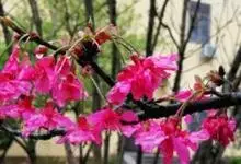 山樱花是蔷薇科李属植物。乔木,高3-8米,树皮灰褐色或灰黑色。小枝灰白色或淡褐色,无毛。冬芽卵圆形,无毛。叶片卵状椭圆形或倒卵椭圆形,上面深绿色,无毛,下面淡绿色,无毛。花序伞房总状或近伞形,…全部>>