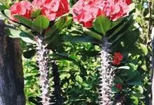 虎刺梅:别称铁海棠,是蔓生灌木植物。茎多分枝,长60-100厘米,直径5-10毫米,具纵棱,密生硬而尖的锥状刺,刺长1-1.5厘米,直径0.5-1.0 毫米,常呈3-5列排列于棱脊上,呈旋转。叶互生…全部>>