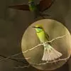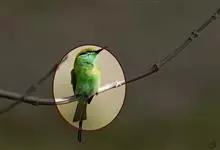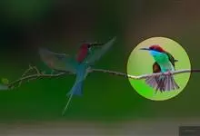 栗喉蜂虎是蜂虎科蜂虎属的鸟类。有热带鸟类羽毛艳丽的特征:喉部是栗红色的,黑色的过眼纹,翅膀和背部是绿色的,尾翼是蓝色的,飞行时翅膀下面的羽毛是橙黄色的,在阳光的照射下,它们全身闪烁着金属般的艳丽光泽,…全部>>