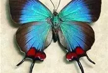 天堂凤蝶翅展可达105mm。前、后翅自基角至后缘约1/2~2/3端为纯净的宝蓝色,后角至后缘1/3~1/2端为黑色,后翅有黑色的尾突。翅背面为棕褐色。全部>>
