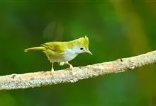 白腹凤鹛是绿鹃科、绿凤鹛属的小型鸟类,体长10-12厘米。上体从头到尾黄绿色,有短的羽冠,头顶微具黑色羽轴纹;眼先、眼周,耳羽和下体灰白色,尾下覆羽黄色。虹膜褐色或红褐色,上嘴浅褐色或肉褐色,…全部>>