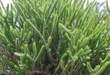 筒叶花月,是景天科青锁龙属的多年生草本植物。植株多分株,灌木状,茎较粗壮,圆柱形,表皮灰褐色;叶片肉质,互生,呈圆筒状,簇生于茎或分枝顶端,叶端呈斜截形,截面为椭圆形;花呈星状,淡白色;花期秋季。…全部>>