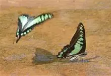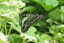 青带凤蝶Graphium sarpedon ,又名青凤蝶,是最普遍的中型凤蝶,飞行速度很快。青带凤蝶的翅膀中央有许多浅蓝色的斑点,很整齐地排列成一条直线。这些斑点由上而下逐渐变大,就像一条青色的带子。全部>>