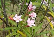 夹竹桃,又名红花夹竹桃、欧洲夹竹桃,是夹竹桃科夹竹桃属的一种常绿直立大灌木,枝条灰绿色,含水液。叶披针形,3叶轮生。聚伞花序顶生,花冠粉红至深红色,花冠漏斗状,有特殊香味。蓇葖果,圆柱形。种子长圆形,…全部>>