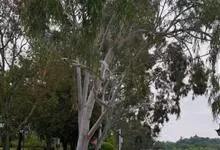 柠檬桉,又名“油加利树”“尤加利树”,是桃金娘科、桉属的常绿大乔木。树高28m,树皮光滑;幼态叶片披针形,有腺毛,基部圆形,叶柄盾状着生,成熟叶片狭披针形;圆锥花序腋生,花蕾长倒卵形;蒴果壶形,…全部>>