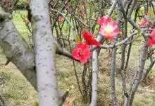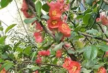 贴梗海棠Nakai)是蔷薇科、木瓜海棠属植物。落叶灌木,高达2米,枝条直立开展,有刺。叶片卵形至椭圆形,稀长椭圆形,长3-9厘米,宽1.5-5厘米。花先叶开放,3-5朵簇生于二年生老枝上。…全部>>