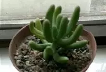 筒叶花月,是景天科青锁龙属的多年生草本植物。植株多分株,灌木状,茎较粗壮,圆柱形,表皮灰褐色;叶片肉质,互生,呈圆筒状,簇生于茎或分枝顶端,叶端呈斜截形,截面为椭圆形;花呈星状,淡白色;花期秋季。…全部>>