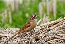 山麻雀:小型鸟类,体长13-15厘米。雄鸟上体栗红色,背中央具黑色纵纹,头棕色或淡灰白色,颏、喉黑色,其余下体灰白色或灰白色沾黄。雌鸟上体褐色具宽阔的皮黄白色眉纹,颏、喉无黑色。…全部>>