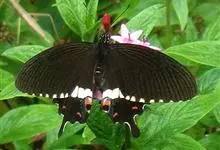 玉斑凤蝶Papilio helenus 别名白纹凤蝶,是凤蝶科凤蝶属美凤蝶亚属大型种类。雌雄同型;体翅皆黑色,后翅正面中室外有3个并列的白色斑,亚外缘有1列模糊的新月形红色斑,…全部>>