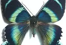 天堂凤蝶翅展可达105mm。前、后翅自基角至后缘约1/2~2/3端为纯净的宝蓝色,后角至后缘1/3~1/2端为黑色,后翅有黑色的尾突。翅背面为棕褐色。全部>>