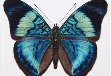 天堂凤蝶翅展可达105mm。前、后翅自基角至后缘约1/2~2/3端为纯净的宝蓝色,后角至后缘1/3~1/2端为黑色,后翅有黑色的尾突。翅背面为棕褐色。全部>>