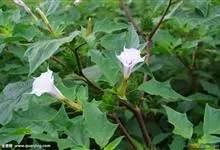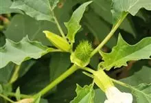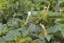 洋金花是茄科曼陀罗属植物,一年生草本植物,全株近于无毛。茎直立,圆柱形,高30~100cm,基部木质化,上部呈义状分枝。叶互生,上部的叶近于对生;叶柄长2~6cm,表面被疏短毛;叶片卵形、长卵形或心形,…全部>>