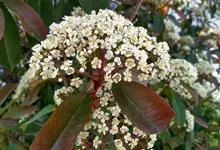 石楠 Kalkman),是蔷薇科石楠属的常绿乔木,高5~12米,株型紧凑,树冠圆球形。树枝为褐灰色;鳞片为褐色,没有毛;叶片革质,长椭圆至侧卵状椭圆形,有锯齿,新叶红色光亮。复伞房花序,白色小花,…全部>>