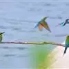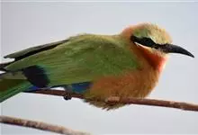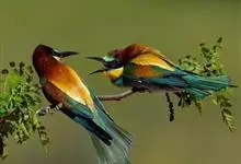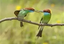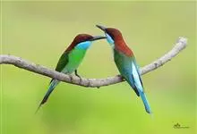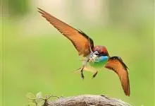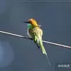 栗喉蜂虎是蜂虎科蜂虎属的鸟类。有热带鸟类羽毛艳丽的特征:喉部是栗红色的,黑色的过眼纹,翅膀和背部是绿色的,尾翼是蓝色的,飞行时翅膀下面的羽毛是橙黄色的,在阳光的照射下,它们全身闪烁着金属般的艳丽光泽,…全部>>