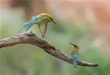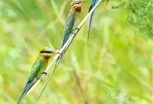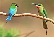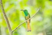 蓝喉蜂是蜂虎科蜂虎属鸟类。体长26-28厘米,嘴长而弯曲,有明显细长的中央尾羽。头部、颈部和背部为巧克力色,有黑色眼纹。喉部、腰部和尾羽为蓝色。腹部和两翼为绿色。幼鸟外观似成鸟,头部、颈部和背部为绿色,…全部>>
