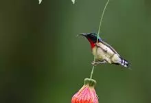 叉尾太阳鸟,雀形目太阳鸟科太阳鸟属留鸟;为小型鸟类,雄鸟头顶辉蓝绿色,上体橄榄绿色,腰明黄色,中央尾羽亮翠蓝色,羽轴针状延长,外侧尾羽黑色具白色端斑,头侧黑色,颜、喉和胸为绛红色,…全部>>