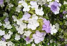 鸳鸯茉莉,茄科鸳鸯茉莉属常绿灌木植物,高1米。茎皮深褐色;分枝力强;单叶互生纸质;花簇生,聚伞花序,花冠五裂花瓣锯齿,含苞时蘑菇状深紫色,花香浓郁;花期4-10月。鸳鸯茉莉花朵芳香,…全部>>