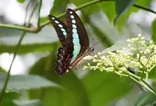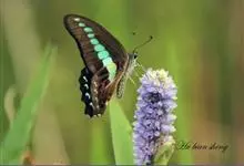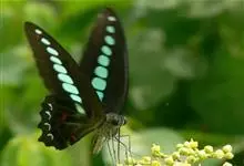 青带凤蝶Graphium sarpedon ,又名青凤蝶,是最普遍的中型凤蝶,飞行速度很快。青带凤蝶的翅膀中央有许多浅蓝色的斑点,很整齐地排列成一条直线。这些斑点由上而下逐渐变大,就像一条青色的带子。全部>>