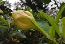 金杯藤 P.S. Green)是茄科、金杯藤属多年生常绿大型藤本。茎及枝条粗壮。叶片互生。长椭圆形。先端突尖。叶面有光泽。全株具有毒乳汁。花顶生,单朵或数朵,花苞棒槌状。从绿色转变为淡黄色。…全部>>