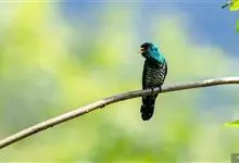 紫金鹃是一种羽色艳丽的小形杜鹃,体长约17厘米。雄鸟头、颈、胸和上体辉紫色,腹白色,具紫蓝色横斑;雌鸟上体淡铜绿色,下体白色,具淡褐色横斑。而相似种翠金鹃雄鸟上体和胸辉绿色,…全部>>
