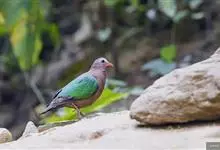 绿背金鸠体长约25厘米,是中等体型、尾甚短的地栖型斑鸠。下体粉红,头顶灰色,额白,腰灰,两翼具亮绿色。雌鸟头顶无灰色。飞行时背部两道黑色和白色的横纹清晰可见。主要栖息于2000米以下的山地森林中,…全部>>