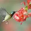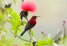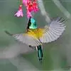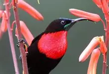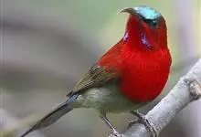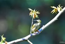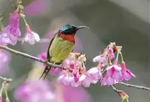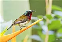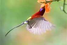 叉尾太阳鸟,雀形目太阳鸟科太阳鸟属留鸟;为小型鸟类,雄鸟头顶辉蓝绿色,上体橄榄绿色,腰明黄色,中央尾羽亮翠蓝色,羽轴针状延长,外侧尾羽黑色具白色端斑,头侧黑色,颜、喉和胸为绛红色,…全部>>