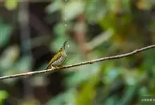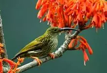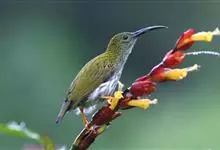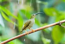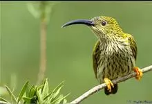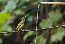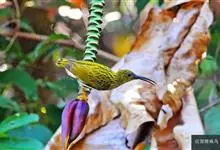 纹背捕蛛鸟:为太阳鸟科捕蛛鸟属的鸟类。是太阳鸟科中体型较大的一种,体重25-45克,体长160-210毫米。嘴粗长而尖且向下弯曲。上体橄榄黄色具黑色中央斑纹。下体淡黄白色满布黑色纵纹,尾具黑色次端斑。…全部>>