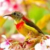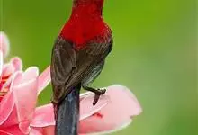 黄腰太阳鸟共有16个亚种,小型鸟类,体长10-15厘米。嘴细长而向下弯曲,雄鸟额和头顶前部金属绿色,头顶后部橄榄褐色。其余头、颈、背、肩、颏、喉、胸以及翅上中覆羽和小覆羽概为红色,腰黄色,…全部>>